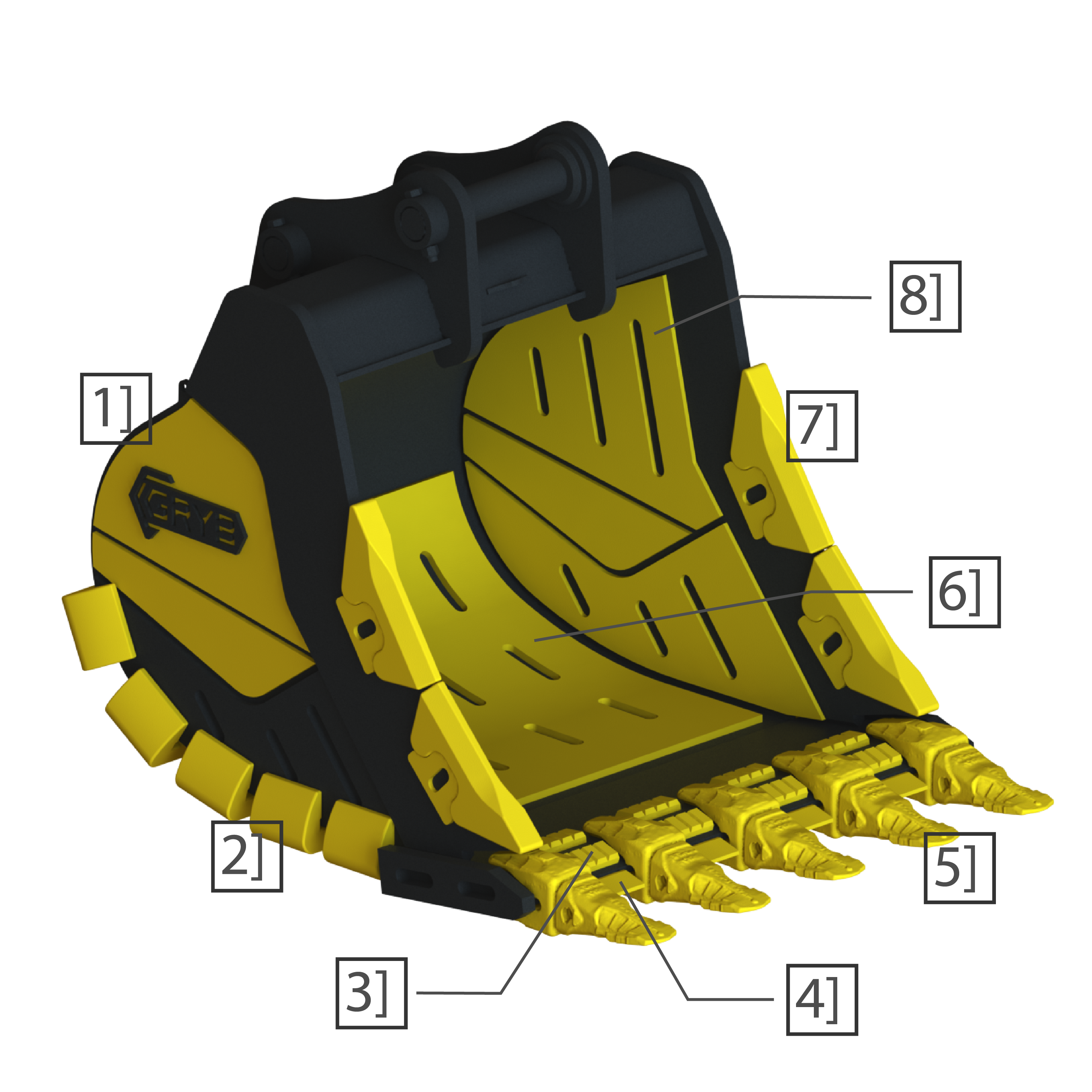 2] Protections de talon: Ces protections d'angle protègent la soudure du godet contre l'usure.